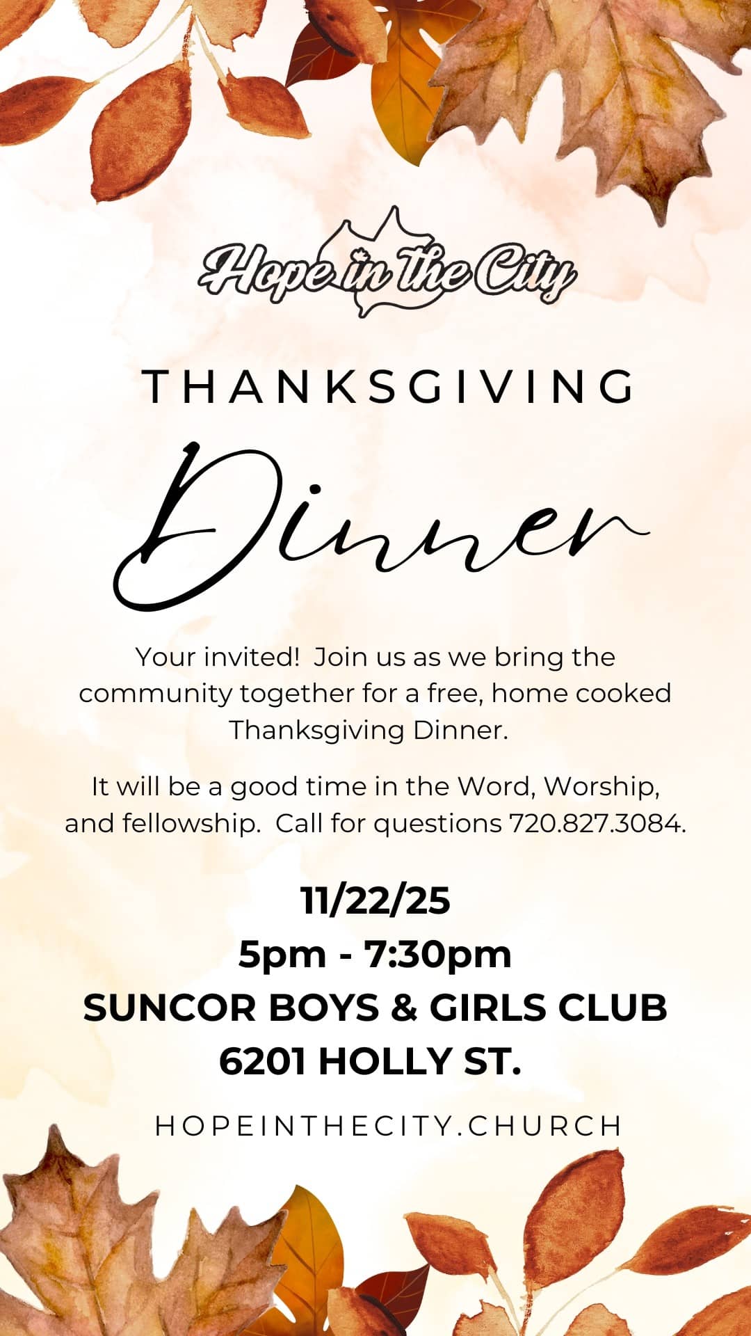Hope in the City is hosting a community Thanksgiving Dinner on Saturday, November 22, 2025, from 5:00 PM to 7:30 PM at the Suncor Boys & Girls Club (6201 Holly…